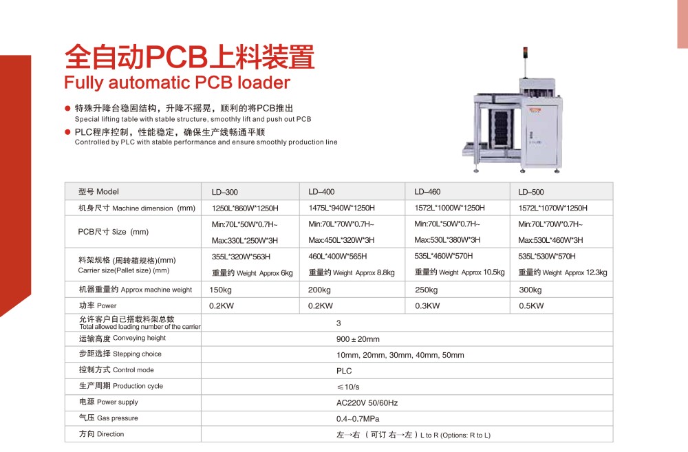 全自動(dòng)PCB上料機(jī)介紹:特殊升降臺(tái)穩(wěn)固結(jié)構(gòu),升降不搖晃,順利的將PCB推出;PLC程序控制,性能穩(wěn)定,確保生產(chǎn)線暢通平順;