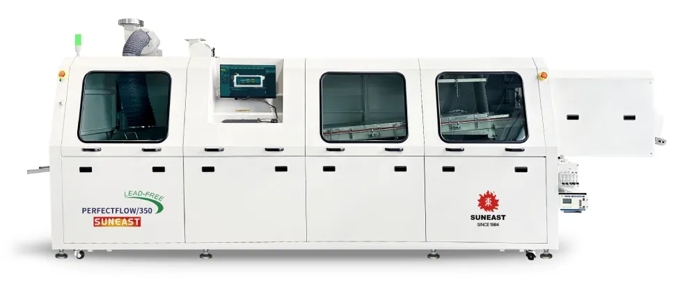 日東科技PERFECTFLOW系列隧道式全程密封氮氣波峰焊,采用全球首創的焊接區密封解決方案和創新的分段傳輸方案,解決了常規隧道式波峰焊的分段輸送卡板、調寬卡頓及使用操作維護不便等問題。消除波峰與錫面落差大的不良影響,將波峰焊接氮氣保護工藝的應用效果發揮到極致,極大地提升了隧道式波峰焊設備性能和焊接工藝品質。