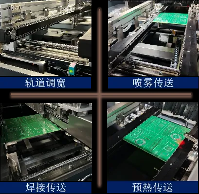 傳送模塊由噴霧傳送、預(yù)熱傳送、焊接傳送三部分組成。適用于傳送工藝邊3mm以上。噴霧和焊接傳送軌道上分別裝有停板定位裝置,確保噴霧及焊接精度。焊接傳送采用滾輪設(shè)計,有效防止高溫形變。