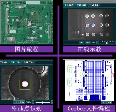 支持CAD、Gerber、坐標文檔、圖片文檔多種方式進行編程,標配示教相機,可在線視覺編程。支持離線編程。每個焊點參數(shù)都可獨立設(shè)置。全程可視化操作,在線調(diào)試方便快捷。自動優(yōu)化焊接順序,節(jié)省焊接時間。可提供MES系統(tǒng)接口。
