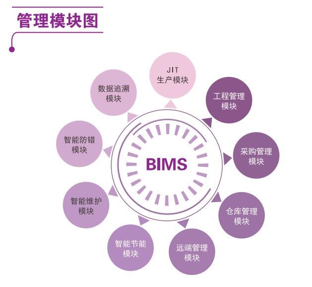 BIMS系統以模塊化的方式提供了一系列獨特的管理工具及方法,可重構生產管理系統或制造執行系統。自主研發的快速重構機制,可根據客戶業務需求,系統各模塊可靈活組裝并深度定制。可快速添加新功能,使BIMS系統更好的延展。從基本功能架構上看,BIMS系統的主要功能包括:JIT生產、數據追溯。智能防錯、智能維護、智能節能、遠端管理、倉庫管理、采購管理和工程管理。實際的客戶系統詳細功能因需定制,與標準的功能架構有所偏差。