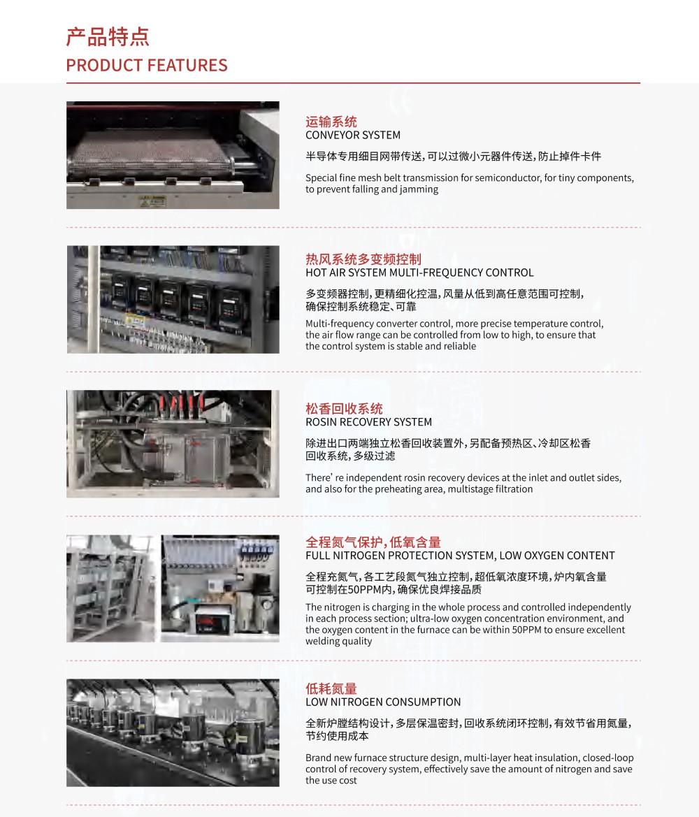 2、 全程氮氣保護,各溫區(qū)氮氣獨立控制, 防止元件在焊接過程中氧化;